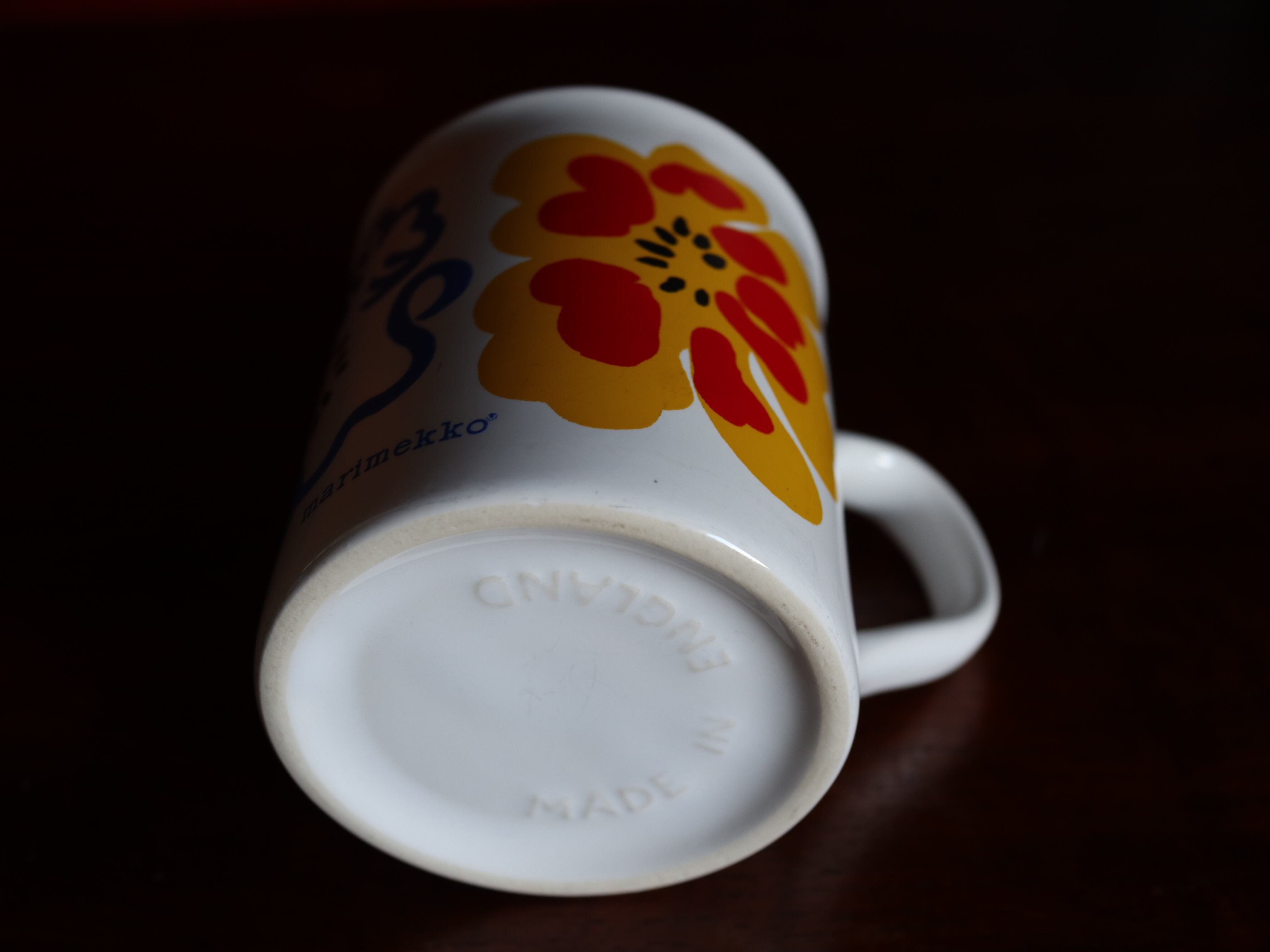 1960〜90年代、marimekkoは陶磁器などのテーブルウェアは自社で製造せずに、別メーカーに製造を依頼していました。マグカップはイギリスの Staffordshire Potteries(スタフォードシャーポッタリーズ)社で製造していました。その為、カップ裏面に「MADE IN ENGLAND」と刻印されています。