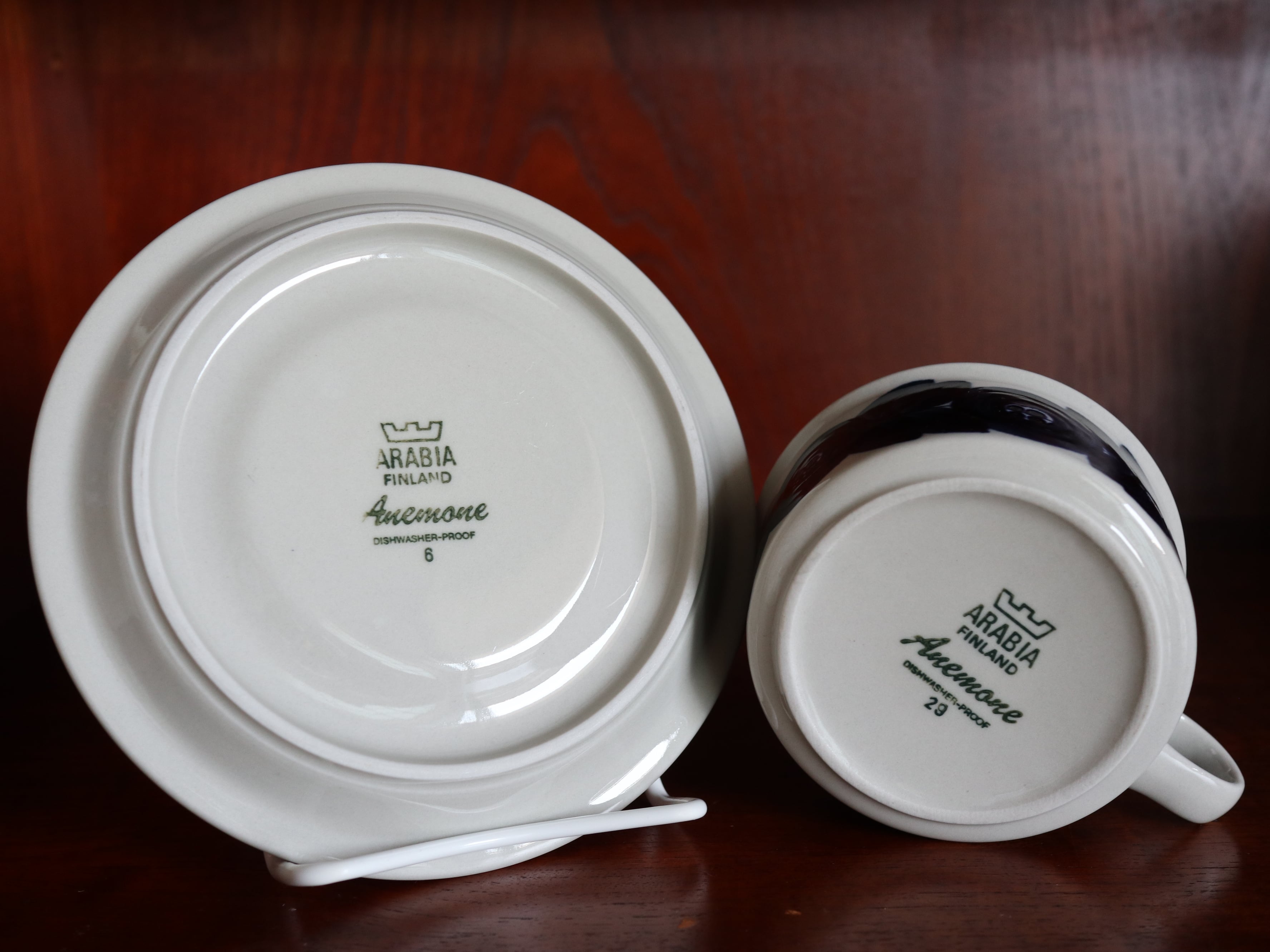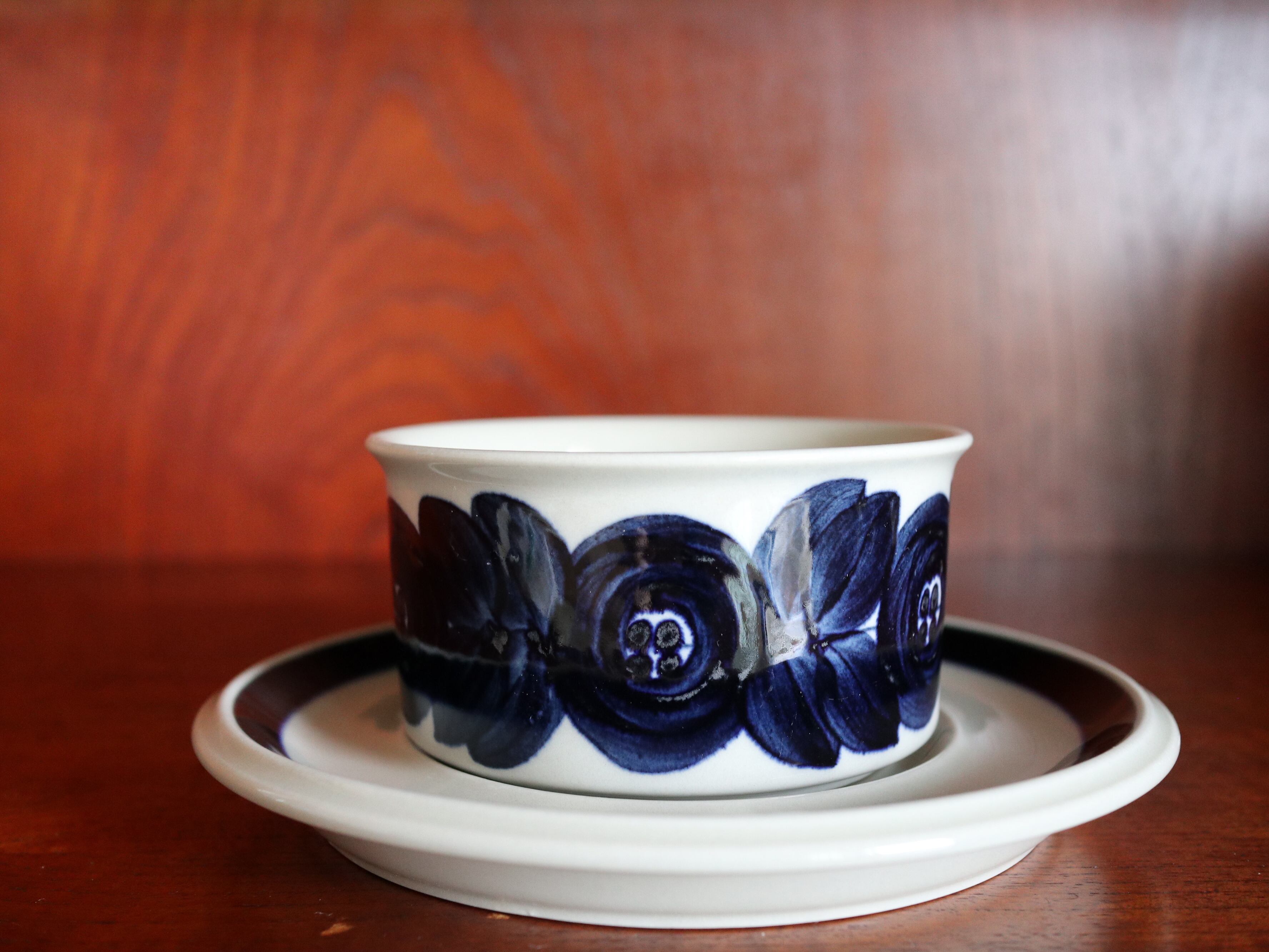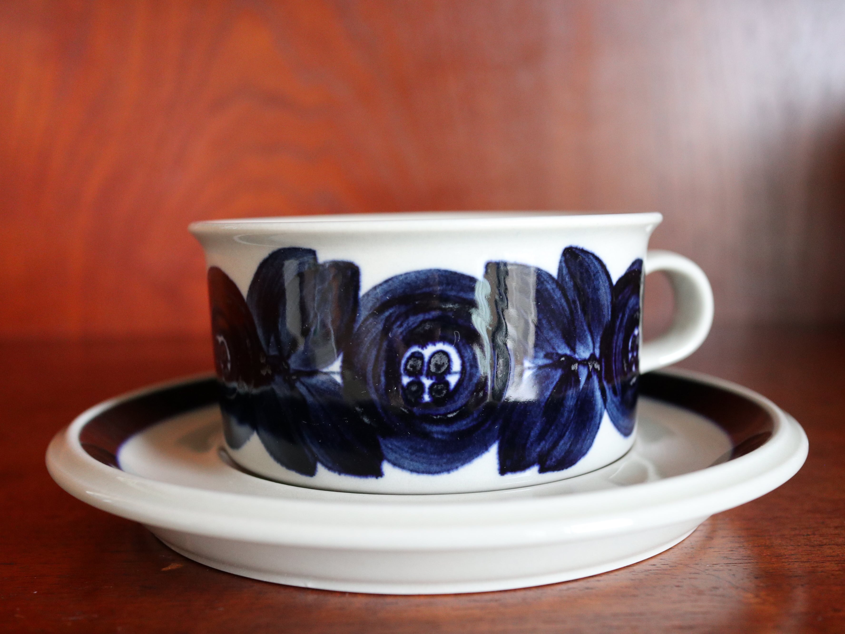 カップの側面いっぱいにアネモネの花がたっぷりと描かれたこのシリーズは、ウラ・プロコッペの代表作。手書きされた深い藍色は和食器のようで、日本でも当時から人気の高いものでした。