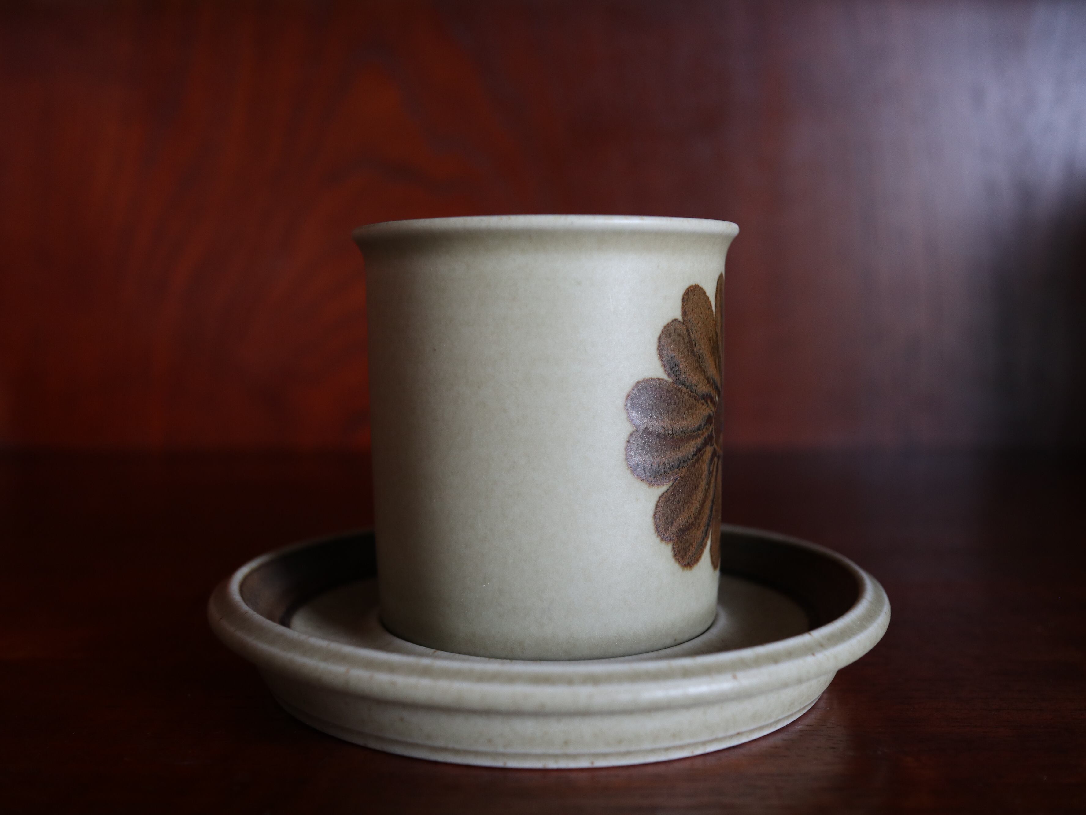 落ち着いたベージュとブラウンの配色で、カップには一輪の花が手描きされています。