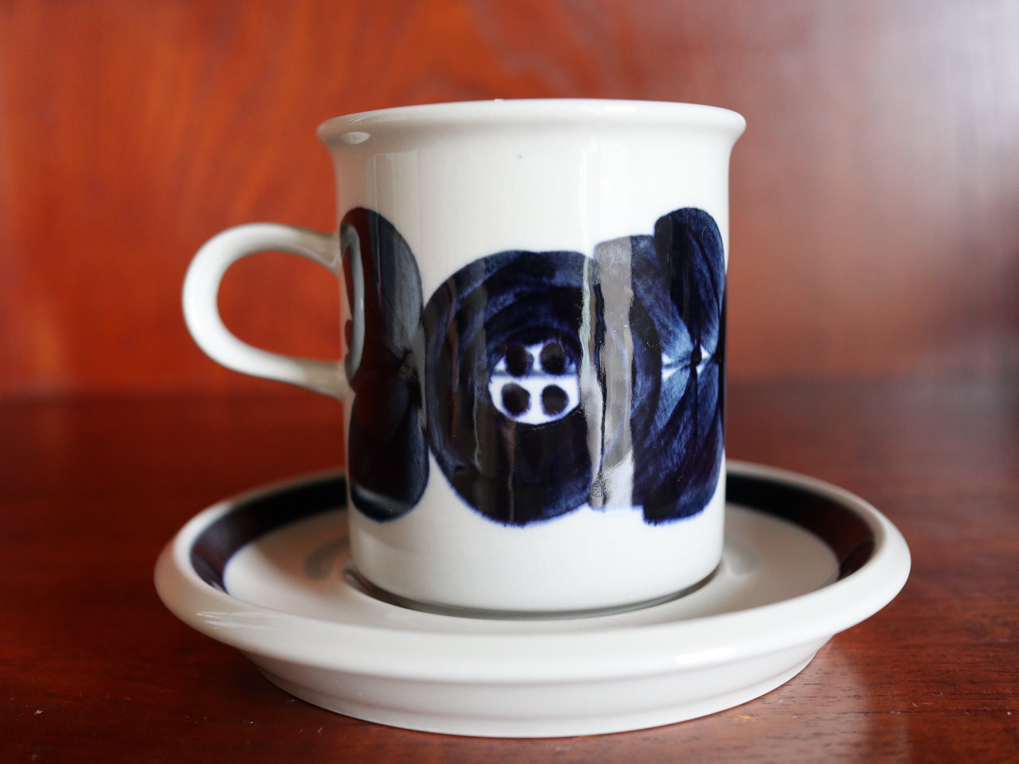 カップの側面いっぱいにアネモネの花がたっぷりと描かれたこのシリーズは、ウラ・プロコッペの代表作。手書きされた深い藍色は和食器のようで、日本でも当時から人気の高いものでした。