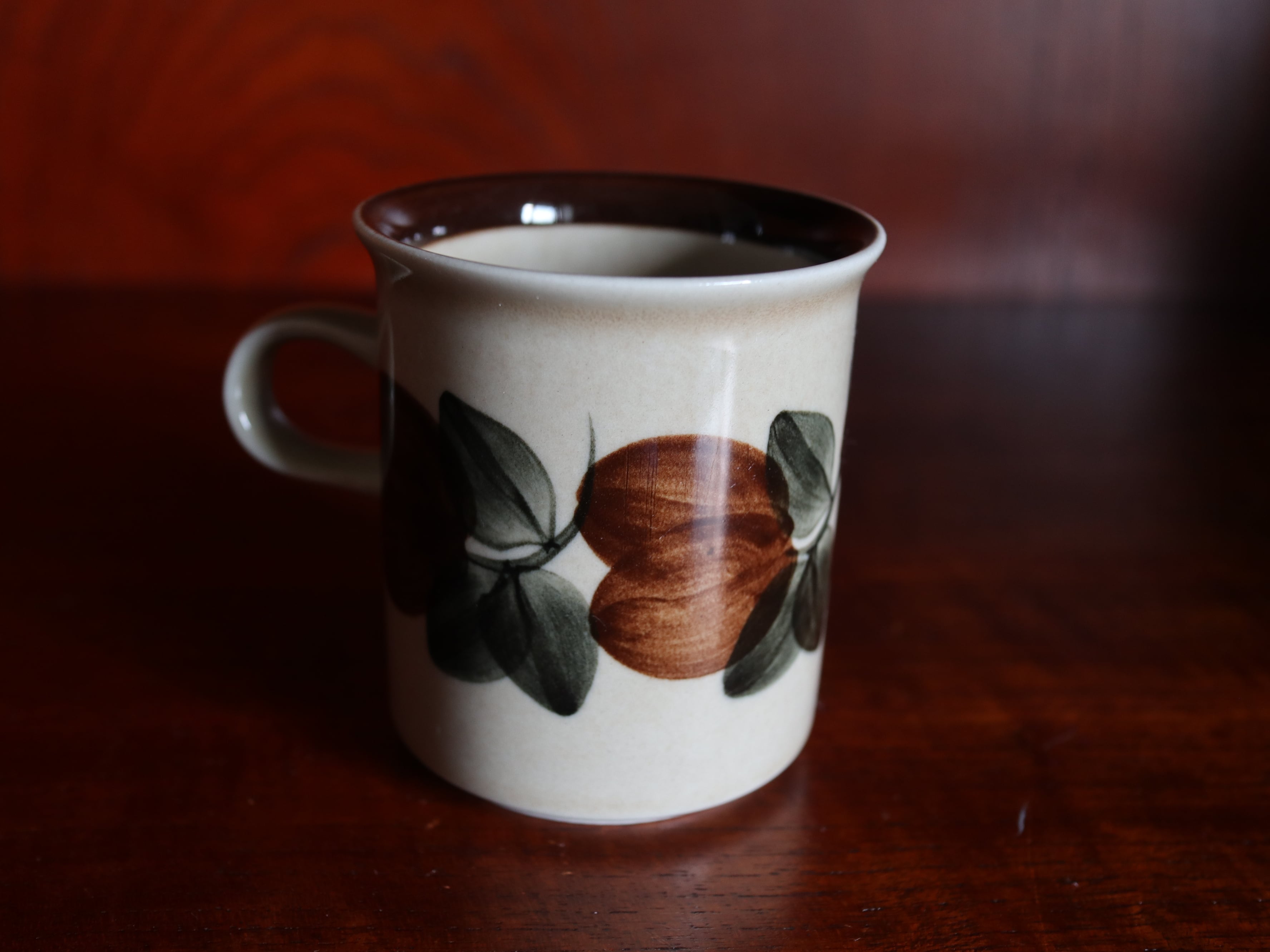茶色と深いグリーンの2色の葉はと素地のベージュ色が一体となって、とても味わい深い印象になっています。どこか懐かしさがあり、こころ温まる雰囲気です。