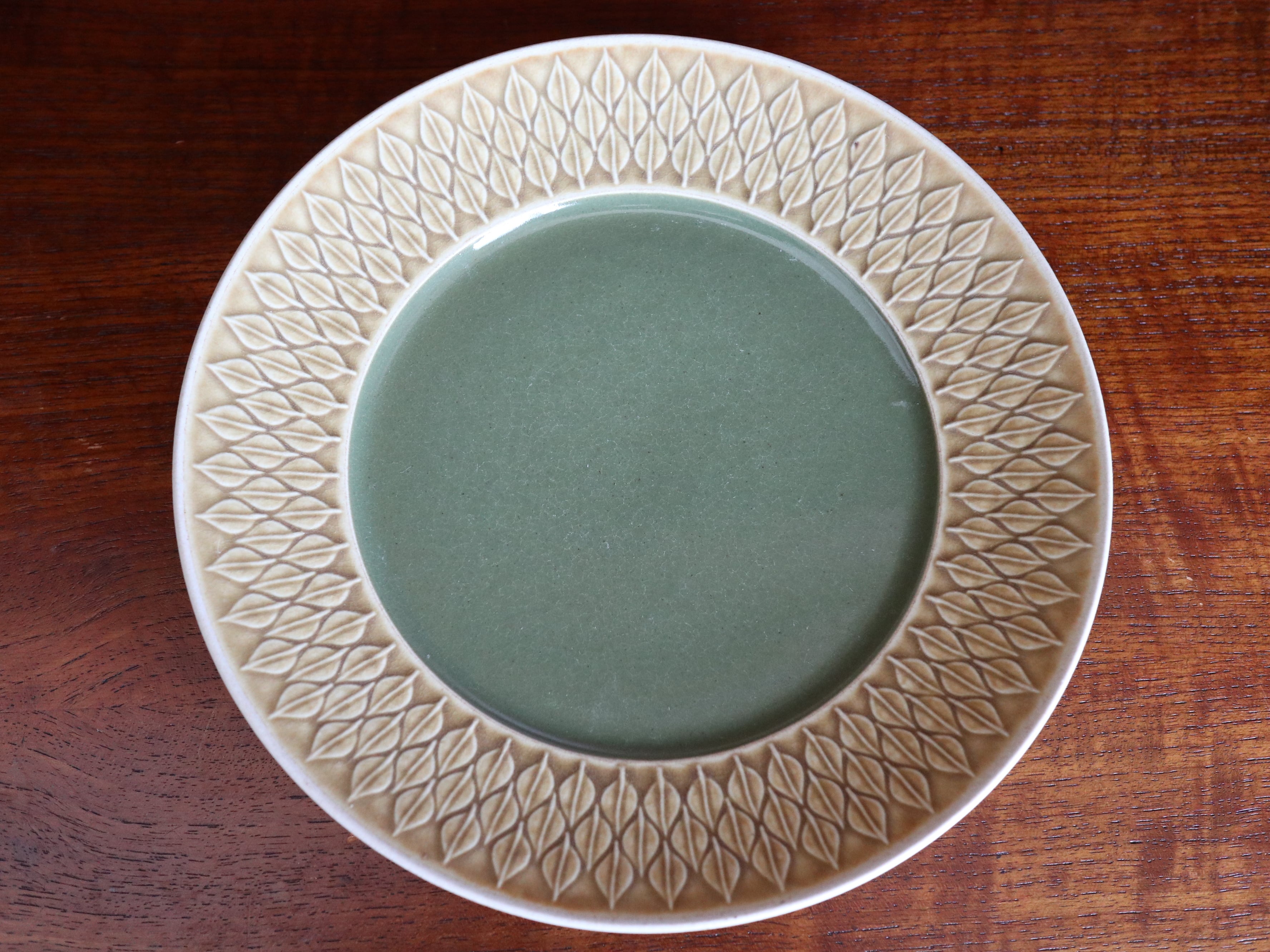 こちらはプレートの中央は艶のあるオリーブ色の釉薬が塗られている大変人気のあるデザインで、ひとつひとつ釉薬の表情が異なります。