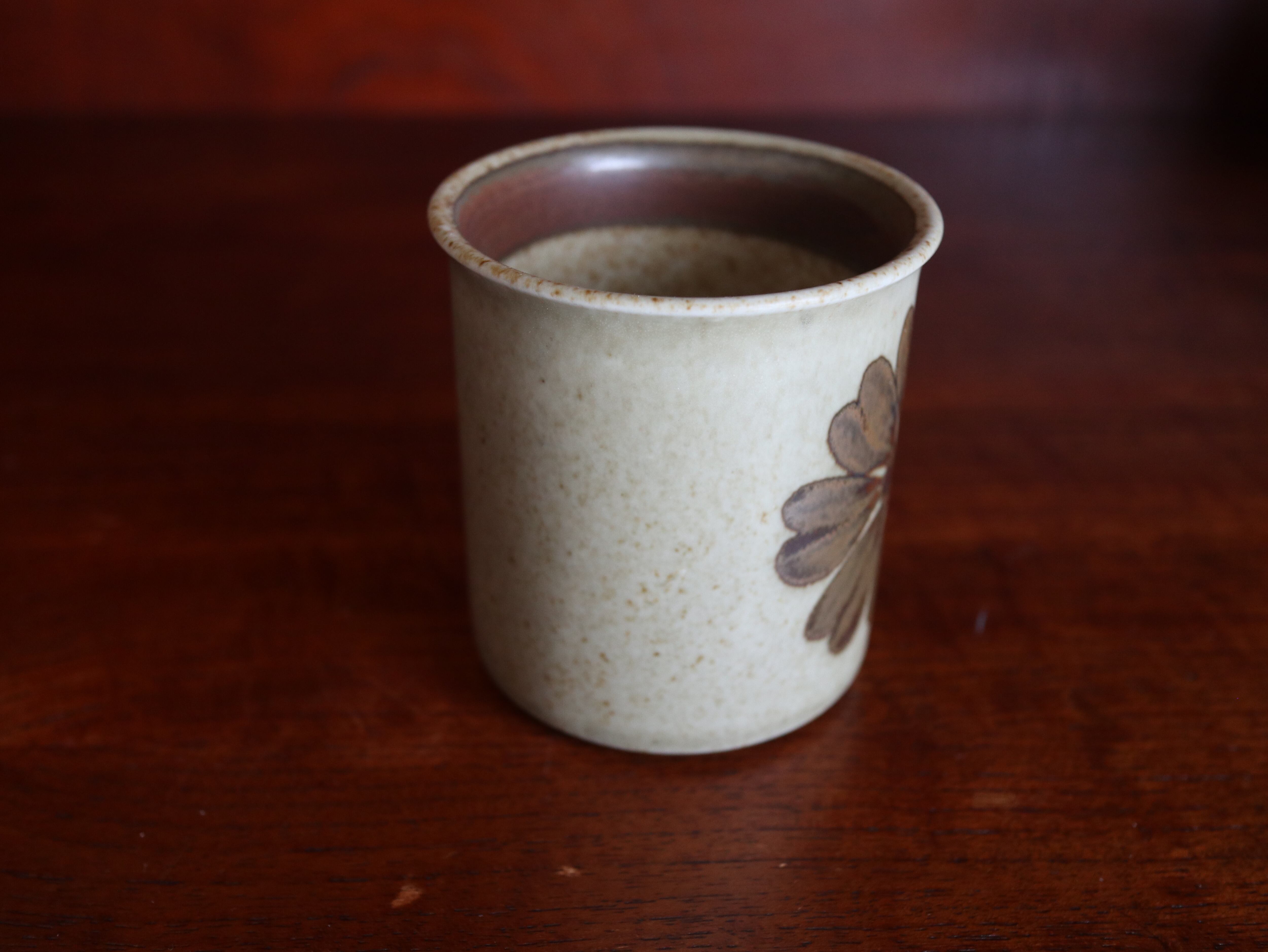 落ち着いたベージュとブラウンの配色で、カップには一輪の花が手描きされています。