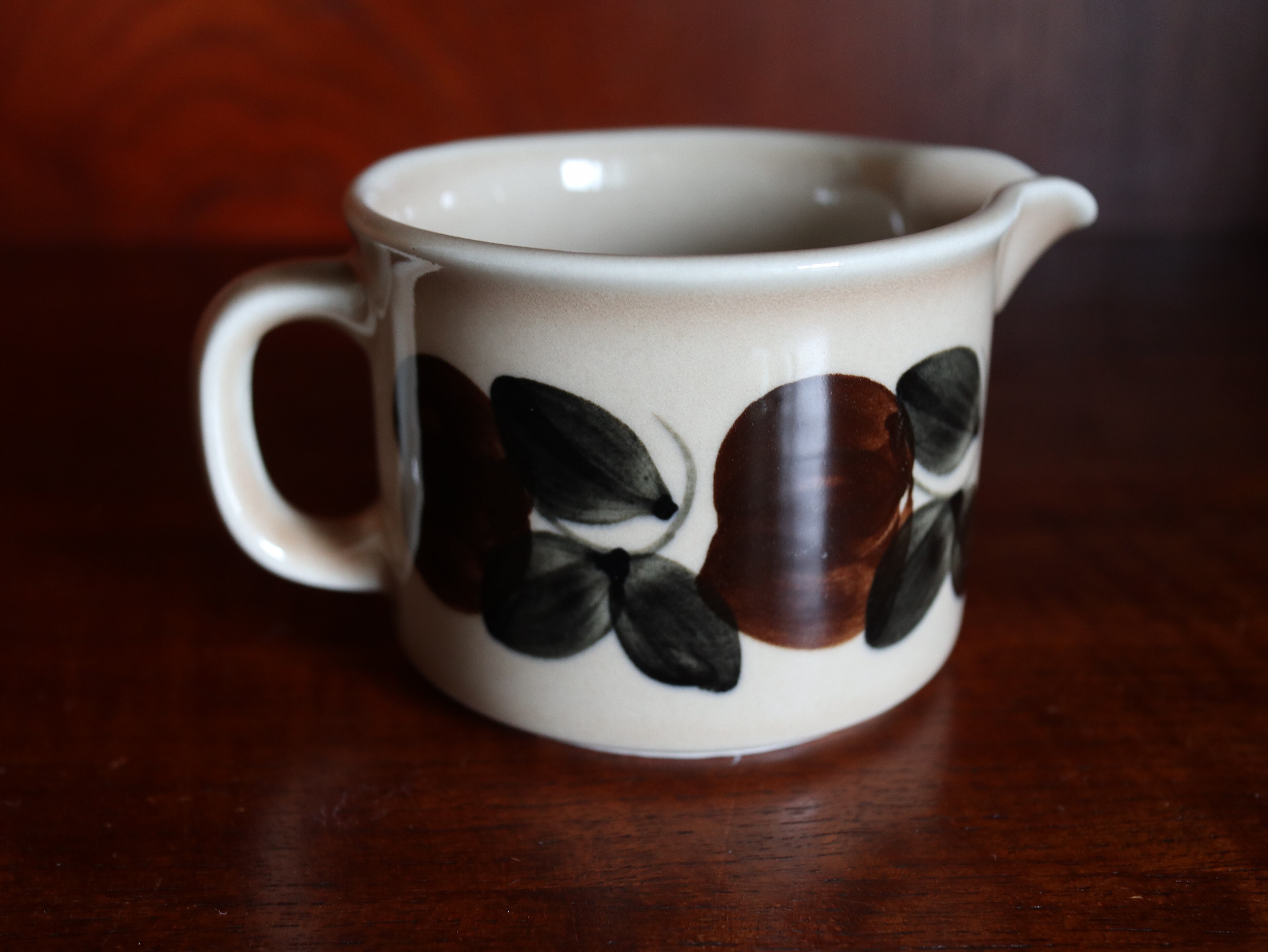アラビアを代表するデザイナー、ライヤ・ウオシッキネンがデザインしたもの。ハンドペイントによる茶色と深いグリーンの2色の葉と、素地のベージュ色が一体となって、とても味わい深い印象になっています。どこか懐かしさがあり、こころ温まる雰囲気です。