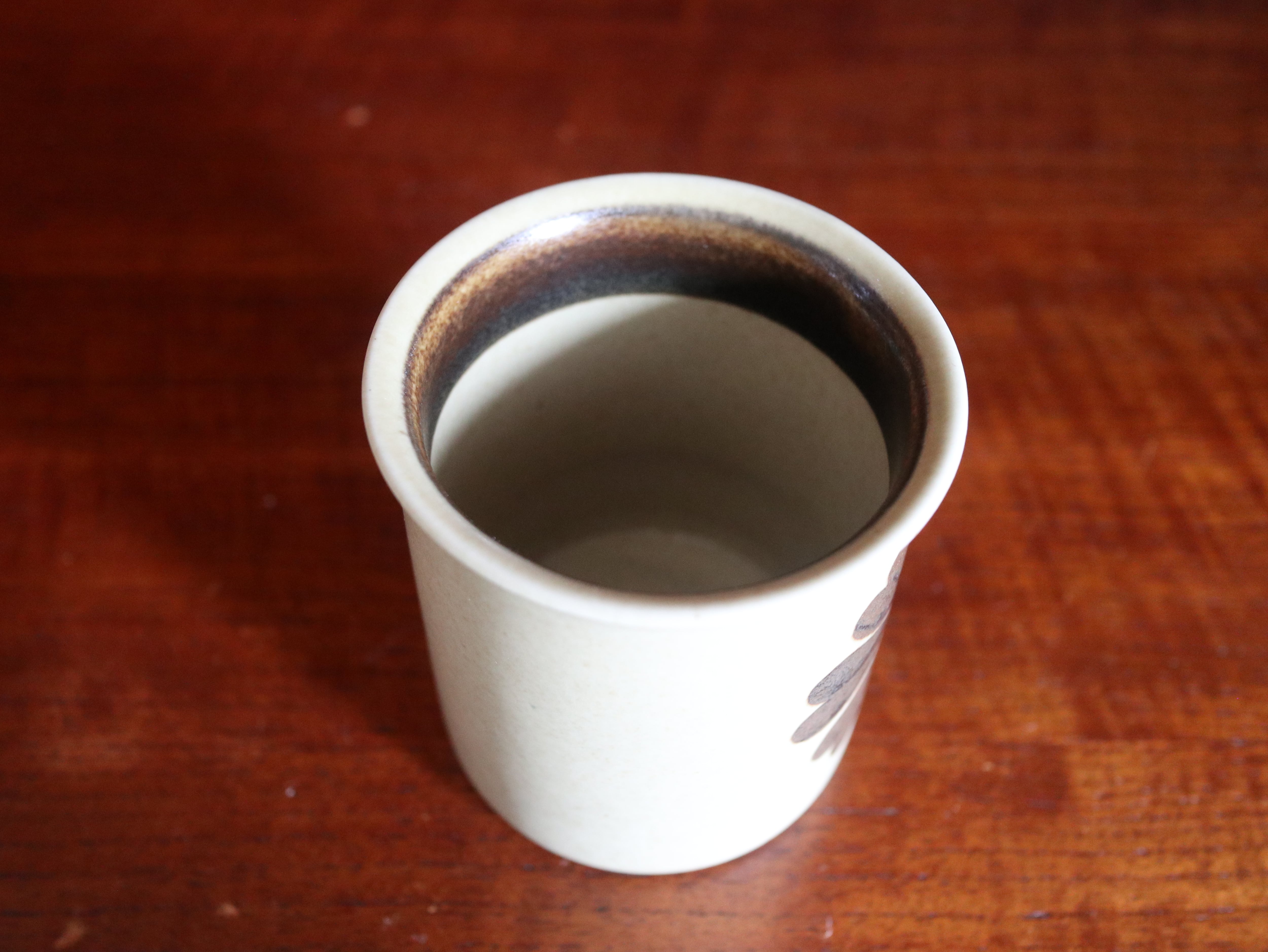 落ち着いたベージュとブラウンの配色で、カップには一輪の花が手描きされています。