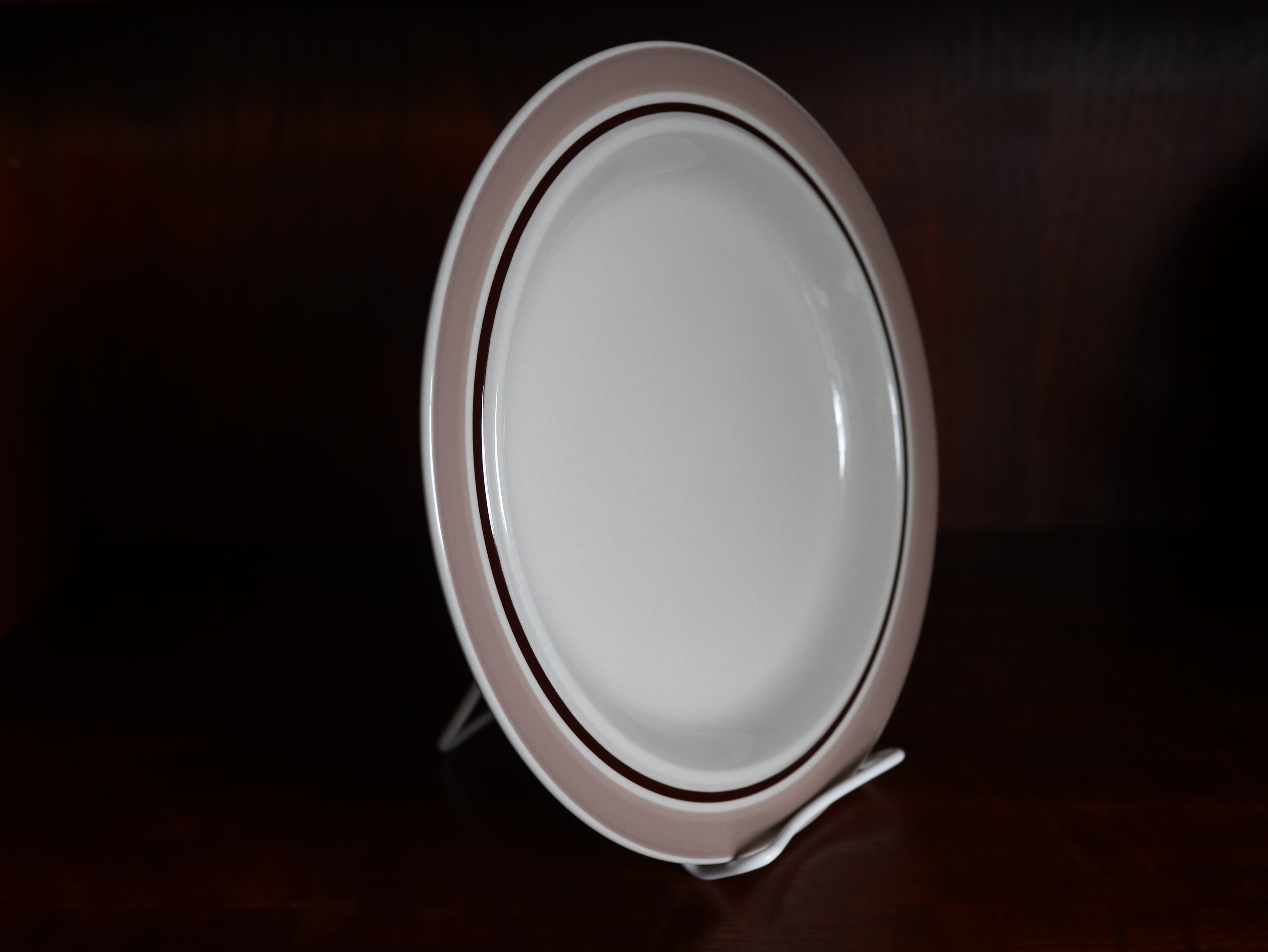 コラッリシリーズは、カップなどにはお花の絵柄がありますが、こちらのプレートは、絵柄はなくシンプルなラインが入っています。外側はピンクベージュ、内側は茶色のラインでとても良いバランスです。