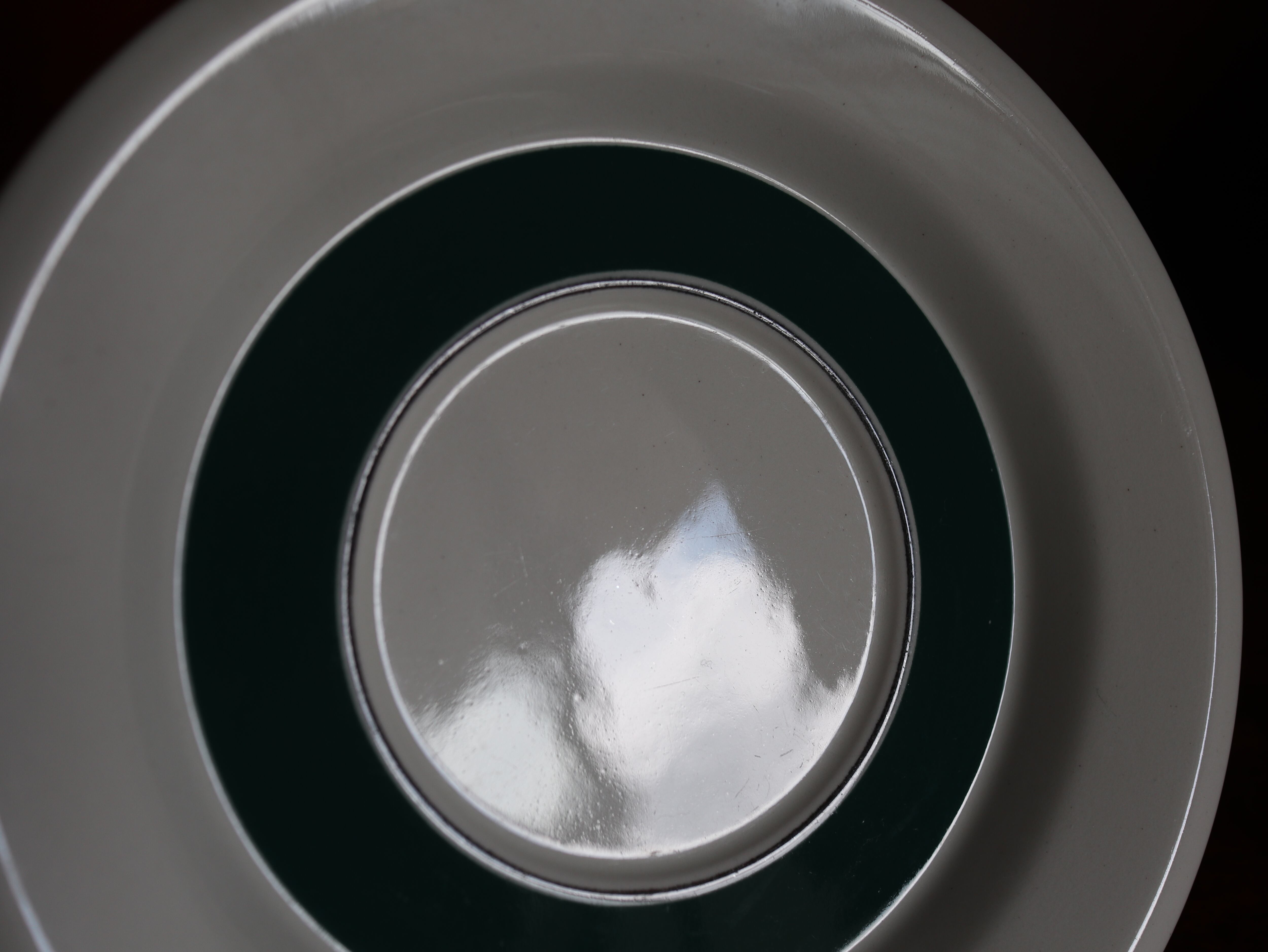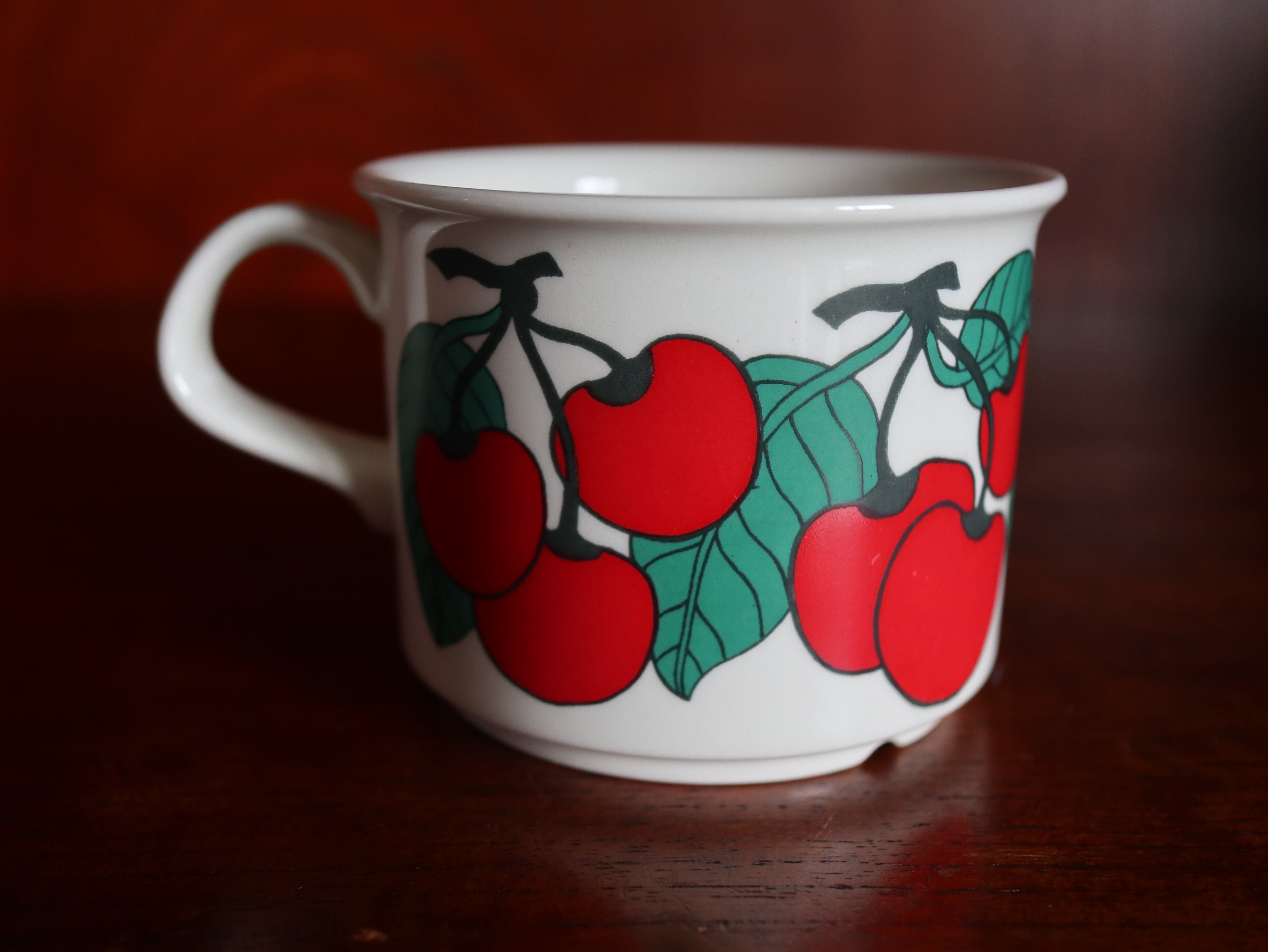 カップいっぱいにさくらんぼの絵が描かれており、どこか懐かしくレトロな雰囲気があります。ソーサーにはラインが描かれており、外側は北欧の緑を連想させるグリーンが優しく、内側は黒のラインが引き締めています。ラインはハンドペイントによるもので味わいがあります。