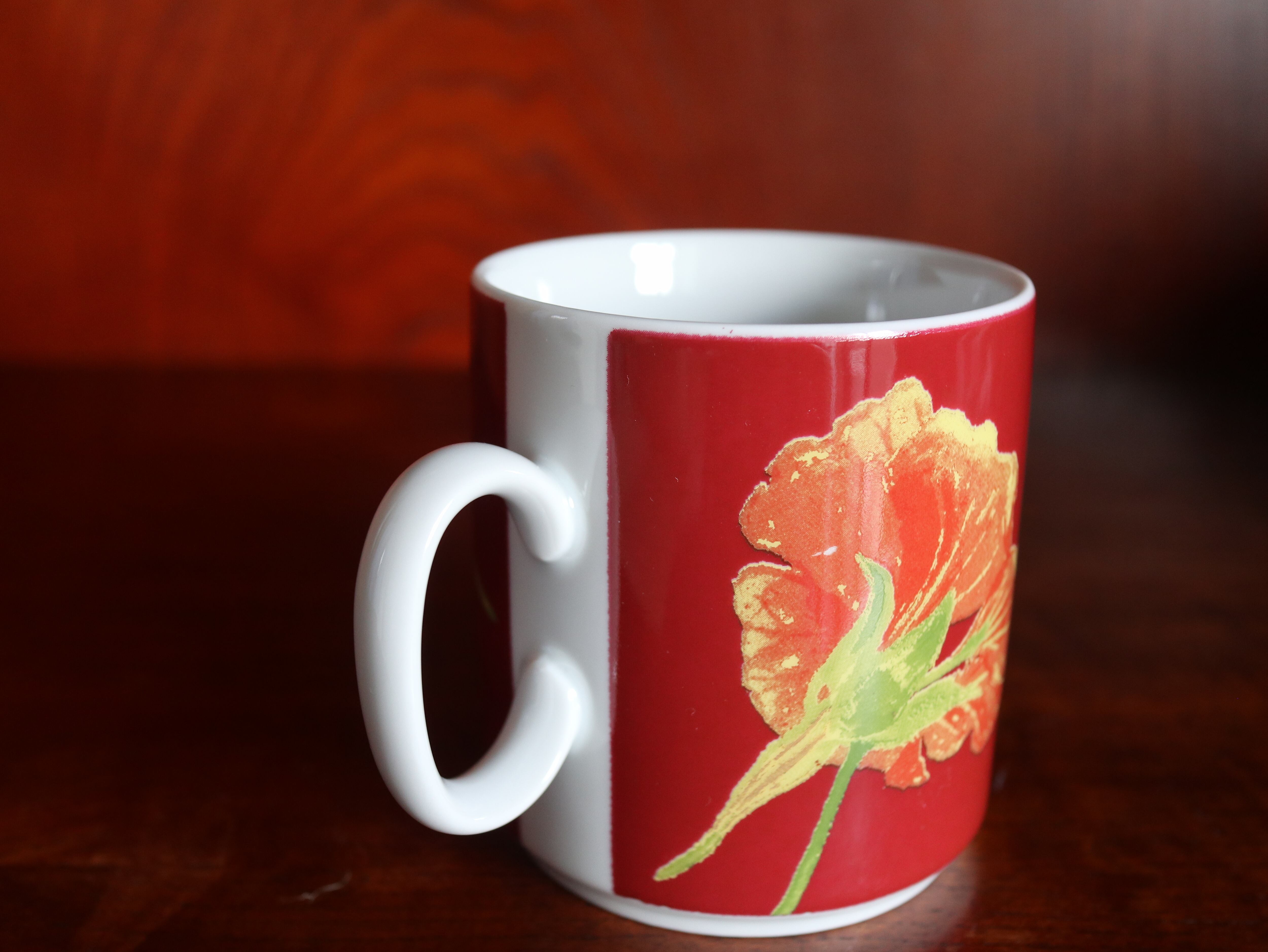 全体は落ちついた赤色で、手書きタッチの優しく優雅な花の絵柄が描かれとても上品な印象。