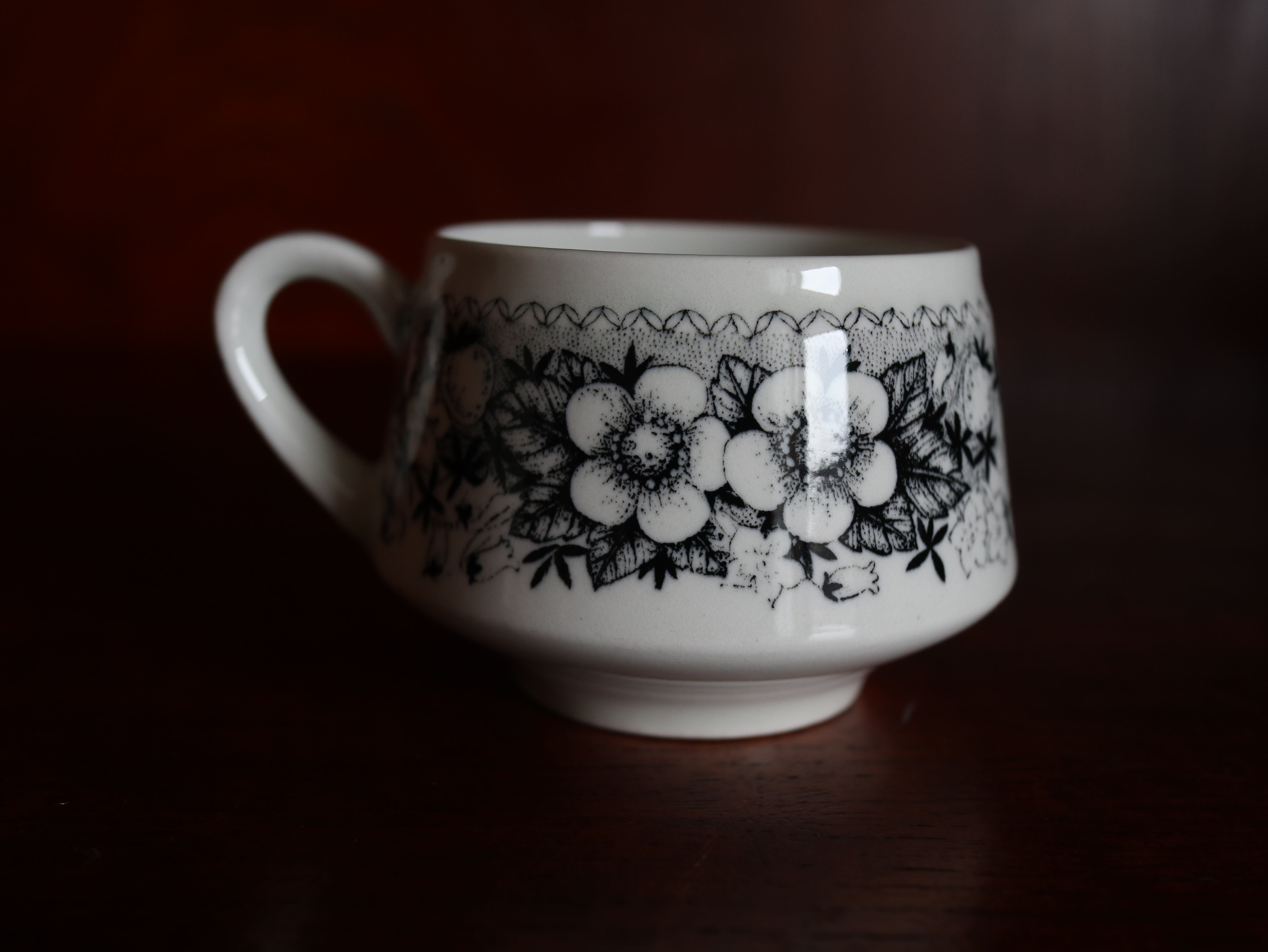 talvikkiとは冬でも緑色の葉をつけるツツジ科の植物。黒のみの色使いでお花とイチゴが華やかに描かれています。アラビアといえば、ずっしり重厚な印象をうけますが、talvikkiシリーズは華奢で可愛く上品なイメージです。