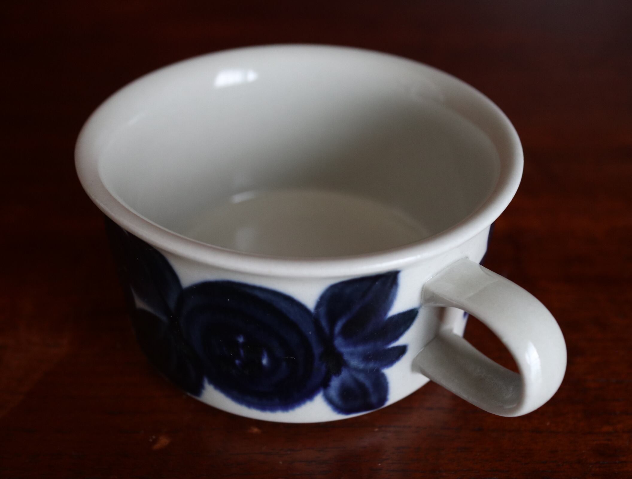 カップの側面いっぱいにアネモネの花がたっぷりと描かれたこのシリーズは、ウラ・プロコッペの代表作。手書きされた深い藍色は和食器のようで、日本でも当時から人気の高いものでした。