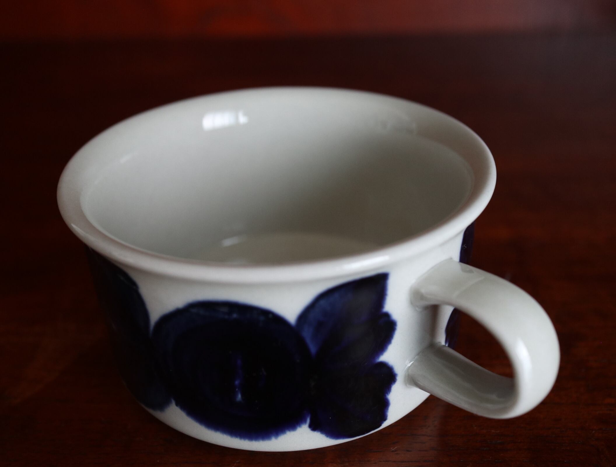 カップの側面いっぱいにアネモネの花がたっぷりと描かれたこのシリーズは、ウラ・プロコッペの代表作。手書きされた深い藍色は和食器のようで、日本でも当時から人気の高いものでした。