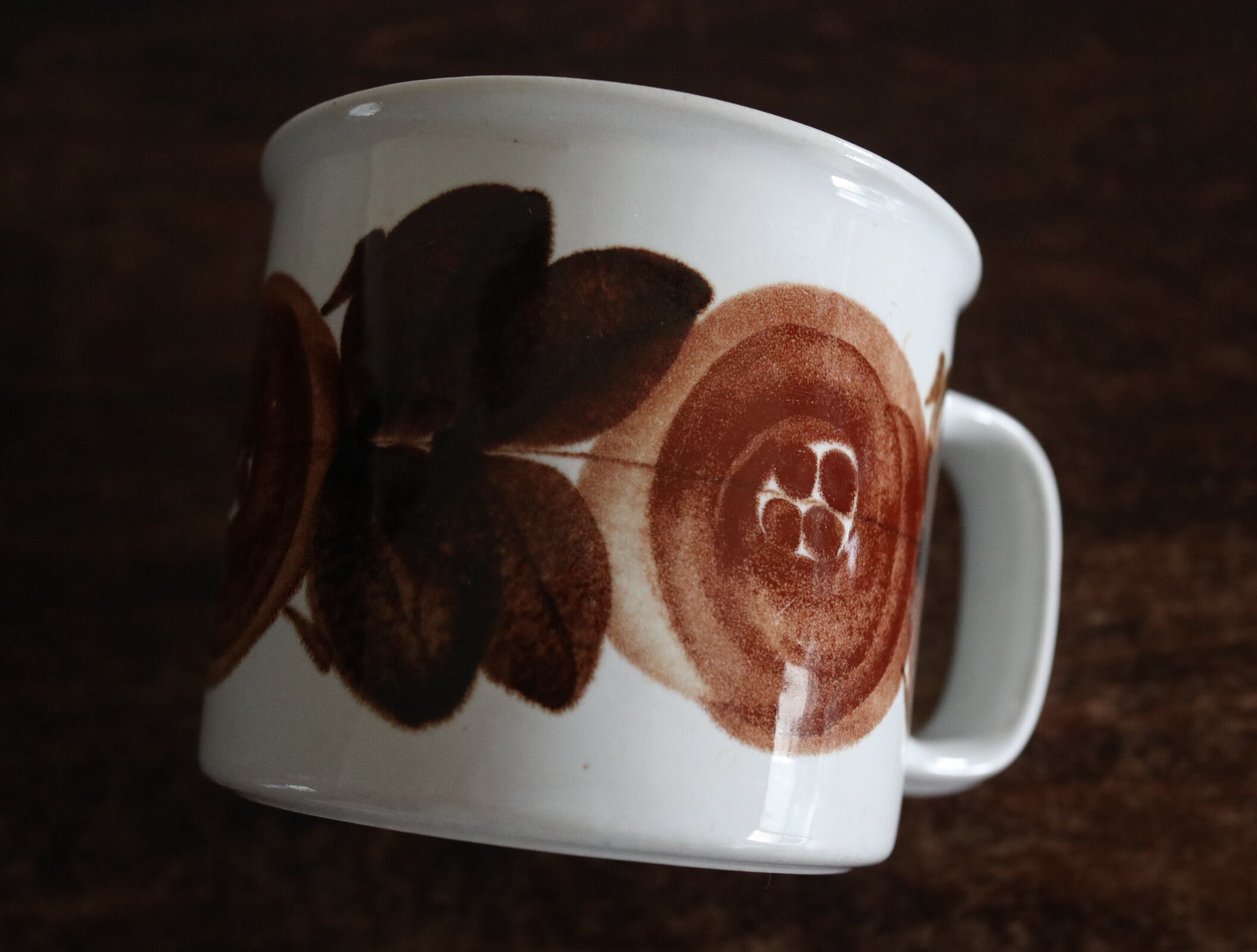 Rosmarinとはフィンランド語でローズマリーを意味し、1点1点絵付師によって大胆に描かれた茶色の花はぽってりとしていて、独特な風合いを感じ取れます。落ち着いた雰囲気にあたたかさがたっぷりと感じられ、いつでもそばに置いてその優しい表情を楽しむ事ができます。