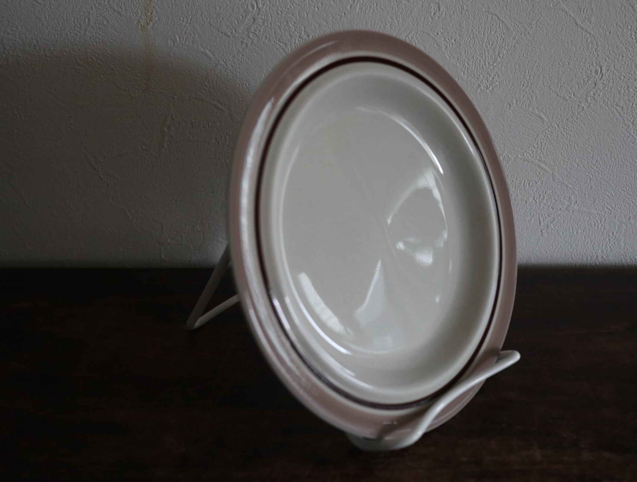 コラッリシリーズは、カップなどにはお花の絵柄がありますが、こちらのプレートは、絵柄はなくシンプルなラインが入っています。外側はピンクベージュ、内側は茶色のラインでとても良いバランスです。パン、サラダ、スウィーツなど、優しい色合いがさりげなく花を添えます。
