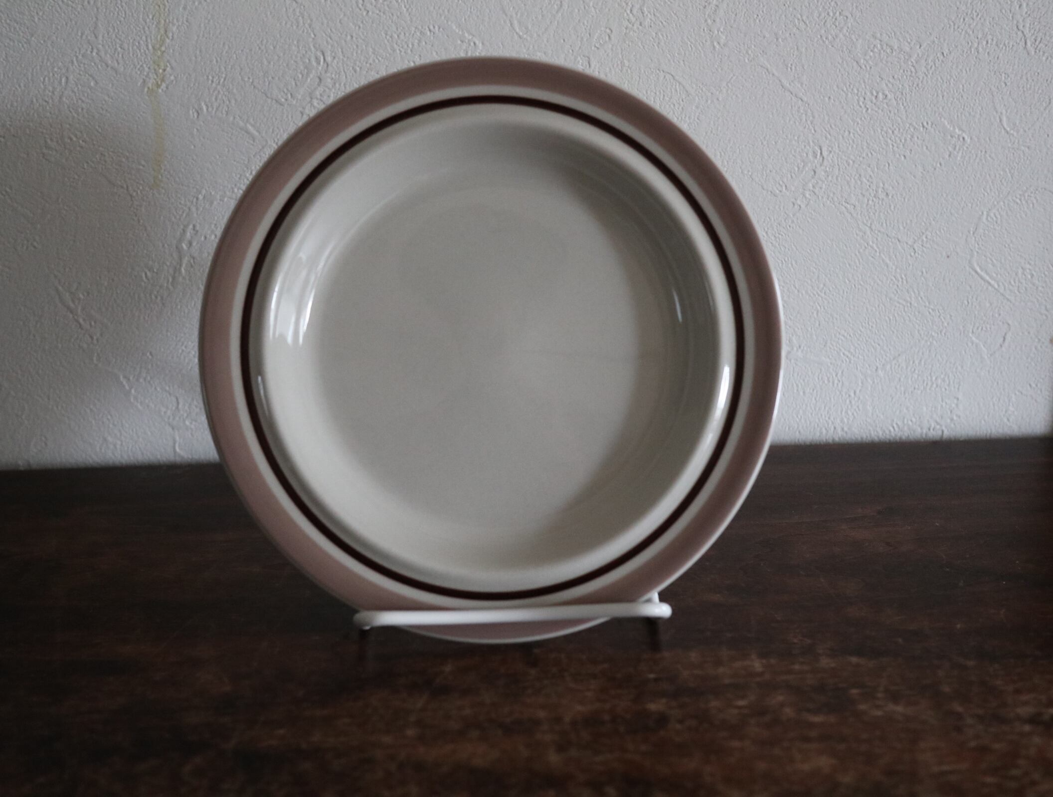 コラッリシリーズは、カップなどにはお花の絵柄がありますが、こちらのプレートは、絵柄はなくシンプルなラインが入っています。外側はピンクベージュ、内側は茶色のラインでとても良いバランスです。パン、サラダ、スウィーツなど、優しい色合いがさりげなく花を添えます。