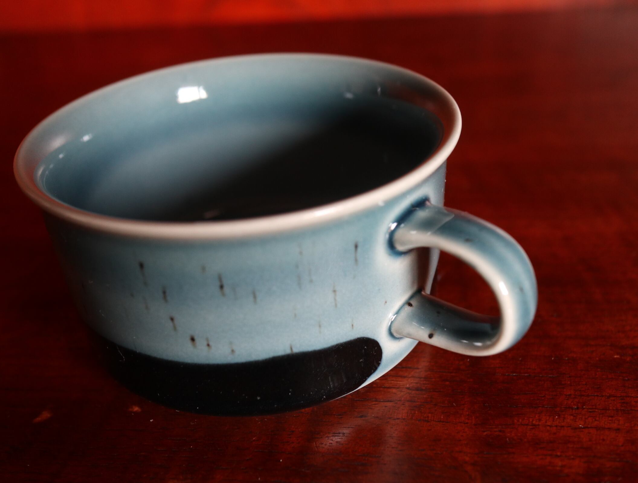 その名を連想させるような、深い青と緑を合わせたような独特な深い色味です。カップには黒、ソーサーの輪郭には茶色と黒のラインは全体を引き締め、海から見える陸を表しているのかもしれません。製造時にできる黒い斑点が点在しており、斑点の多さ、場所は、個体差があり表情豊かにしています。