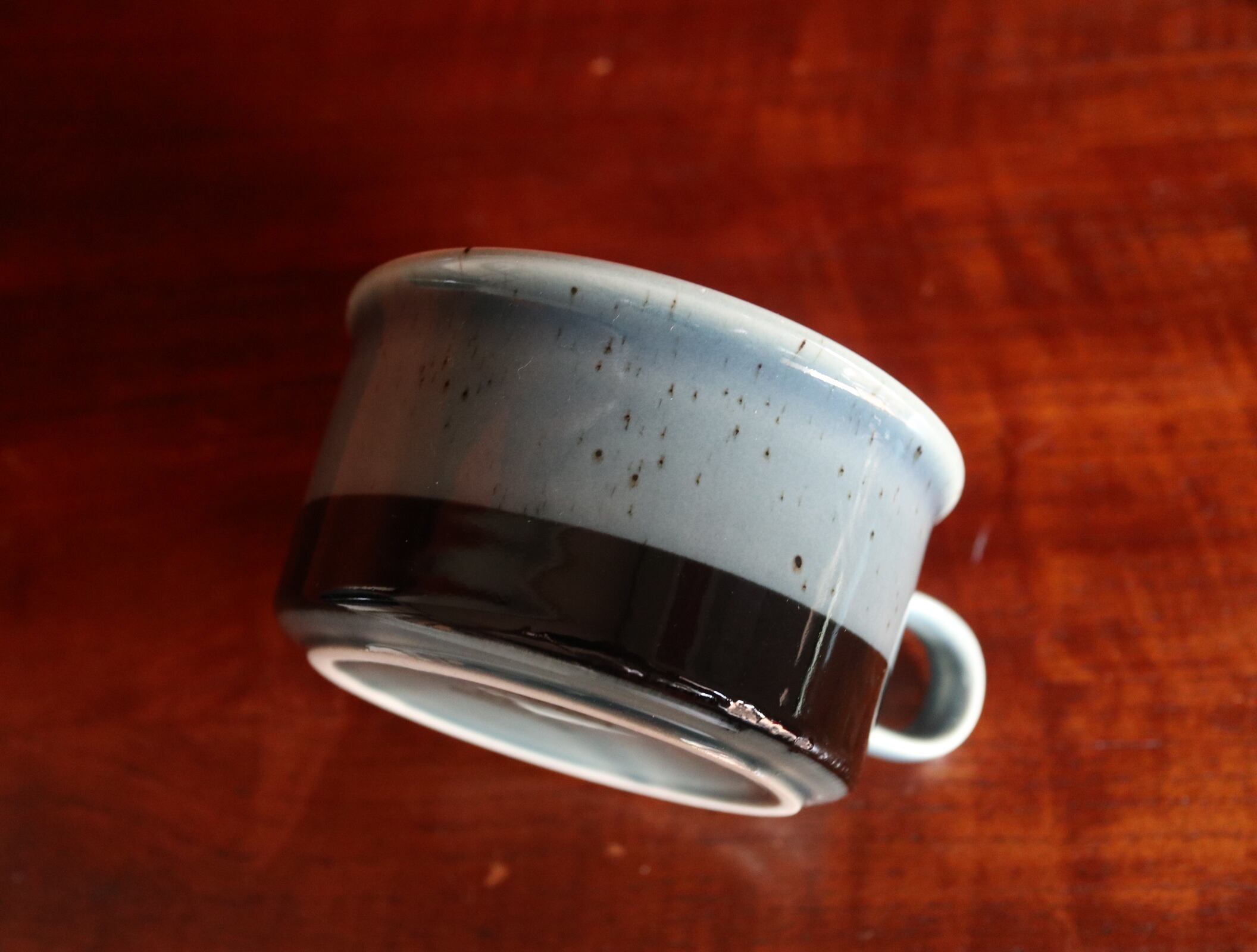 その名を連想させるような、深い青と緑を合わせたような独特な深い色味です。カップには黒、ソーサーの輪郭には茶色と黒のラインは全体を引き締め、海から見える陸を表しているのかもしれません。製造時にできる黒い斑点が点在しており、斑点の多さ、場所は、個体差があり表情豊かにしています。