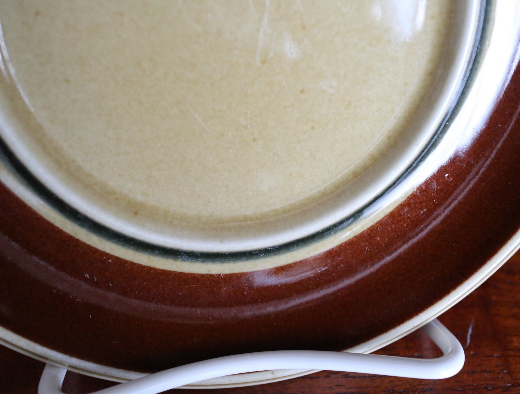 ソーサー:中央や輪郭(濃い茶色)部分に傷が多く見られます。特に中央に傷がありますが、平面だと目立ちにくいです。