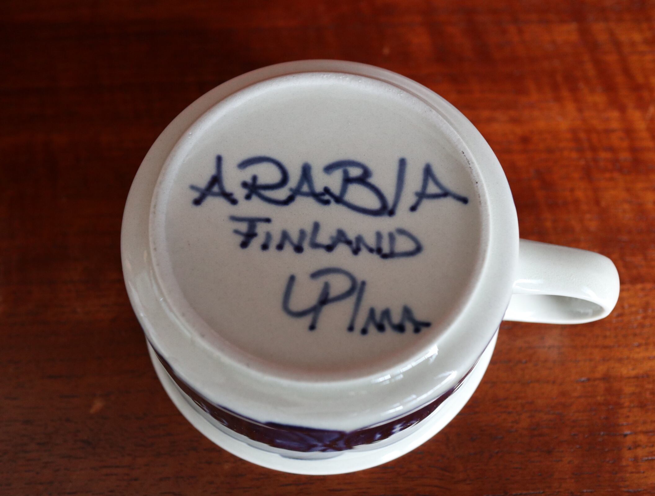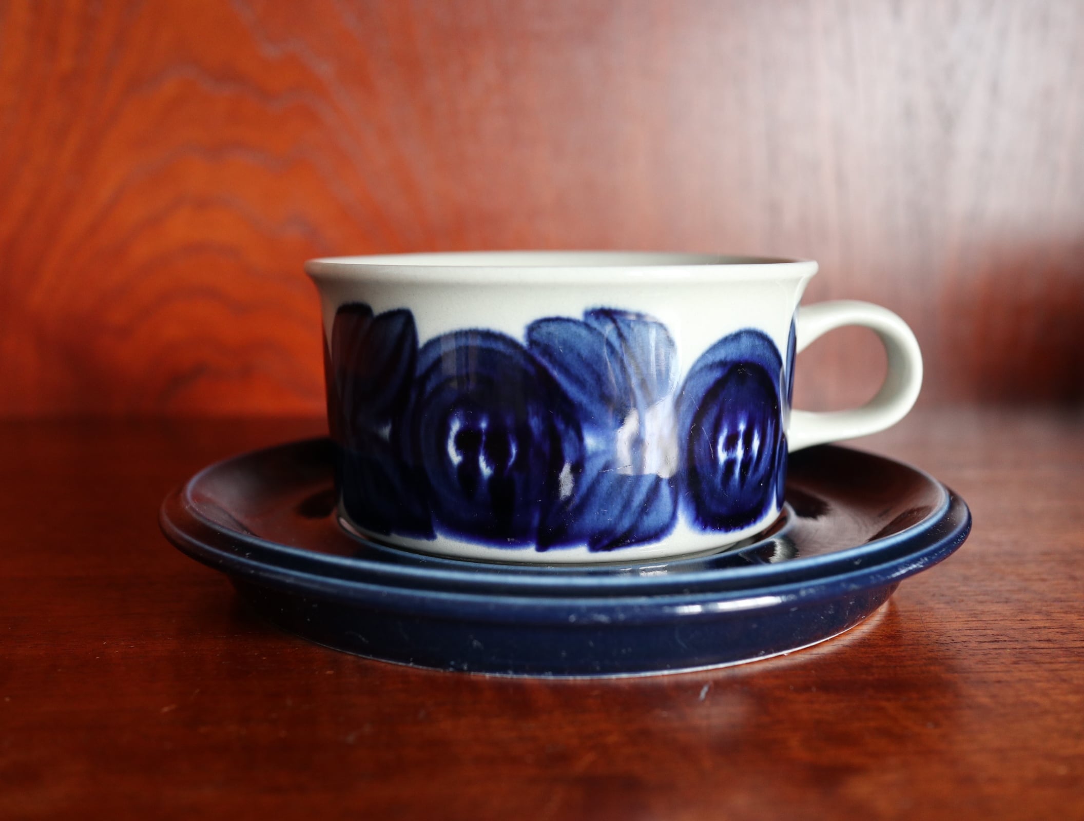 カップの側面いっぱいにアネモネの花がたっぷりと描かれたこのシリーズは、ウラ・プロコッペの代表作。手書きされた深い藍色は和食器のようで、日本でも当時から人気の高いものでした。