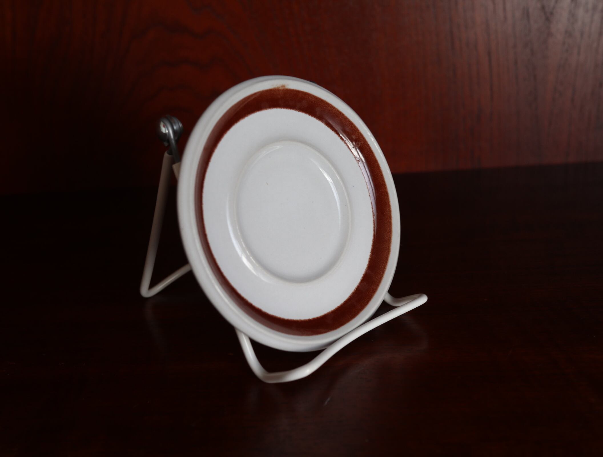 ソーサ:小さな傷がありますが、目立ちにくく良い状態です。輪郭の茶色の部分に、スレのようにまだらになっている箇所があります。ペイントとびが1箇所あります(写真12枚目)